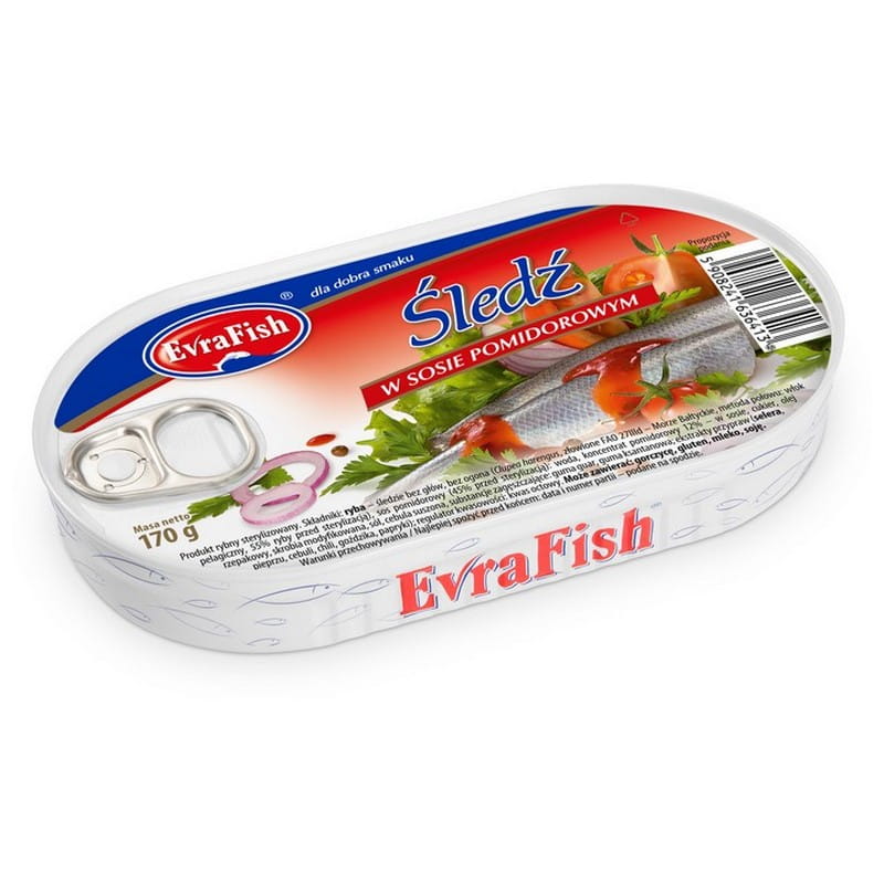 Śledź w pomidorach Evrafish to produkt stworzony z myślą o osobach lubiących ryby, dla których zdrowotne aspekty pożywienia odgrywają szczególnie ważną rolę w życiu. Produkt niezwykle pożywny oraz smaczny.