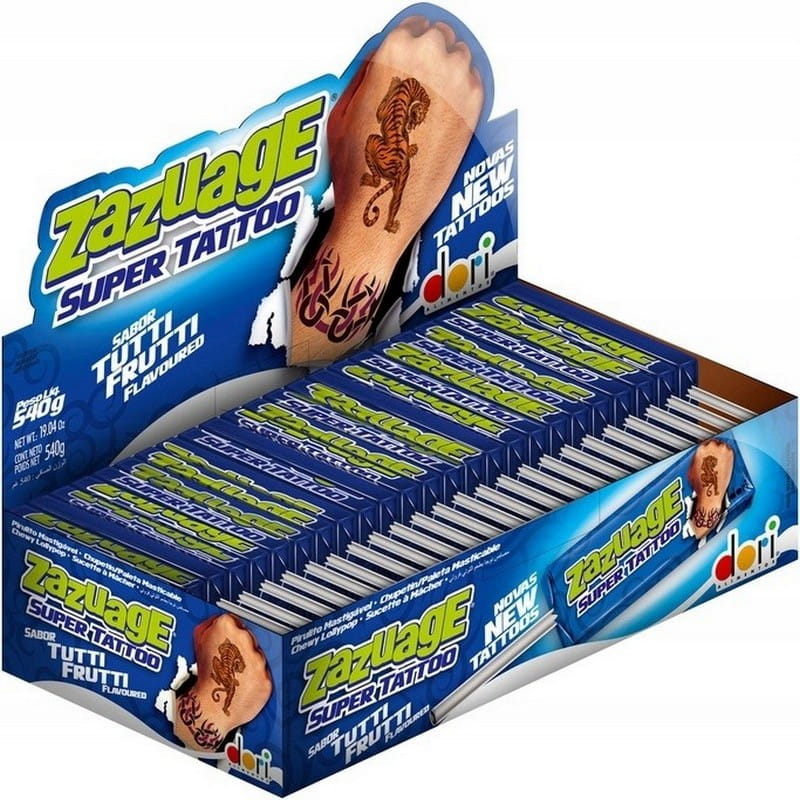 Lizak Zazuag Tutti-Frutti z tatuażem to owocowa eksplozja smaków, która zapewnia świetną zabawę i pyszne doznania! Każdy lizak ma soczysty, tutti-frutti smak, a do tego dołączony jest tatuaż, który można przenieść na skórę. Idealny wybór na prezent lub słodką atrakcję dla dzieci!