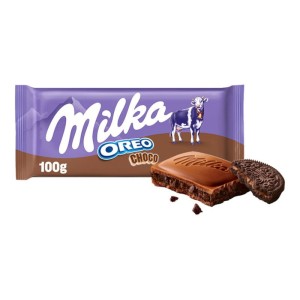 Mleczna czekolada z alpejskiego mleka z nadzieniem kakaowym (40%) oraz chrupiącymi, pokruszonymi ciastkami Oreo (12%). Czekolada łączy kremową konsystencję Milki z unikalnym smakiem kakaowego nadzienia i delikatną chrupkością Oreo – idealna jako przekąska lub składnik deserów.