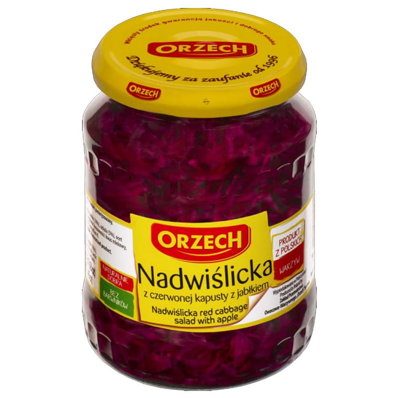 Orzech Sałatka Kapusta Czerwona z Jabłkiem 870g to gotowa sałatka, łącząca chrupiącą, czerwoną kapustę z delikatnym, słodkim smakiem jabłek. Kapusta jest starannie posiekana i wymieszana z kawałkami jabłek, a całość jest przyprawiona odpowiednio, aby uzyskać idealną równowagę między kwaskowatością a słodyczą. Sałatka ma świeży, lekko słodkawy smak i jest doskonałym dodatkiem do mięs, wędlin czy jako samodzielne danie. Opakowanie 870g jest praktyczne, idealne na większe rodzinne posiłki, imprezy czy jako część codziennego menu.
