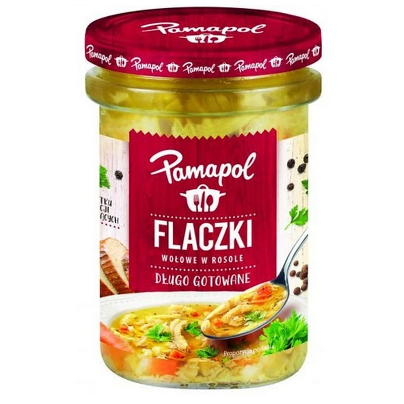 Tradycyjny polski rosół w połączeniu z aromatycznymi flaczkami to danie, obok którego ciężko przejść obojętnie. Sycące, idealnie doprawione, a co najważniejsze, gotowe w zaledwie kilka minut. Flaczki wołowe są zawekowane w słoiku, co daje gwarancję jakości i doskonałego smaku. To idealna propozycja na obiad dla całej rodziny.