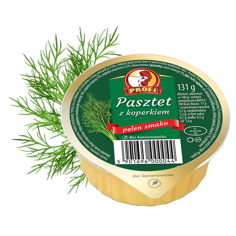 Profi Pasztet Wielkopolski z koperkiem 131g to aromatyczny pasztet wzbogacony świeżym, ziołowym smakiem koperku. Ten klasyczny pasztet łączy delikatną, kremową konsystencję z subtelną nutą ziołową, co czyni go idealnym dodatkiem do pieczywa. Doskonały na kanapki, jako przekąska w ciągu dnia, czy składnik wykwintnych przystawek. Starannie wyselekcjonowane składniki oraz tradycyjna receptura gwarantują wyjątkowy smak i najwyższą jakość.