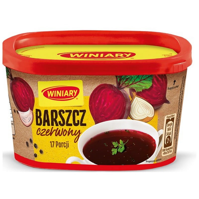 Winiary Barszcz Czerwony Instant w opakowaniu 170g to szybki i prosty sposób na przygotowanie tradycyjnego barszczu czerwonego o intensywnym smaku buraków. Dzięki starannie dobranym składnikom, ten barszcz zapewnia autentyczny smak i aromat, idealny na rodzinne obiady i świąteczne posiłki. Wystarczy dodać proszek do gorącej wody i zamieszać, aby w kilka minut cieszyć się pyszną zupą. Praktyczne opakowanie 170g jest wygodne w przechowywaniu i wystarcza na kilka porcji, co czyni go idealnym wyborem dla osób ceniących sobie szybkie i smaczne rozwiązania w kuchni.