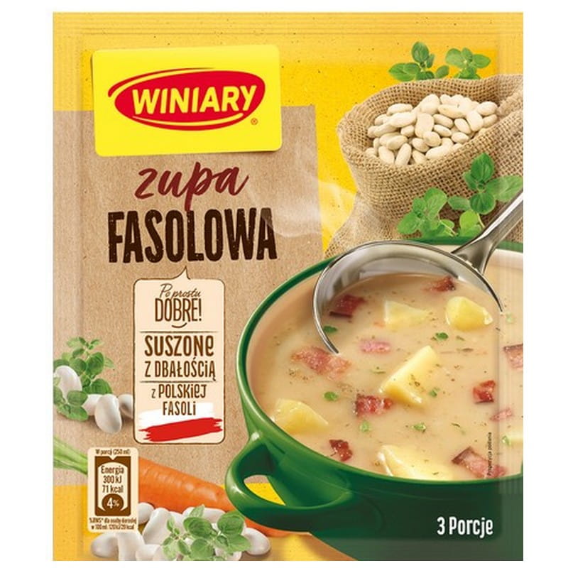 Winiary Zupa Fasolowa w opakowaniu 65g to łatwy i szybki sposób na przygotowanie tradycyjnej, sycącej zupy fasolowej. Dzięki tej zupie w proszku, możesz cieszyć się głębokim smakiem i aromatem fasoli z dodatkami, takimi jak marchew, cebula i przyprawy, które są już włączone do mieszanki.