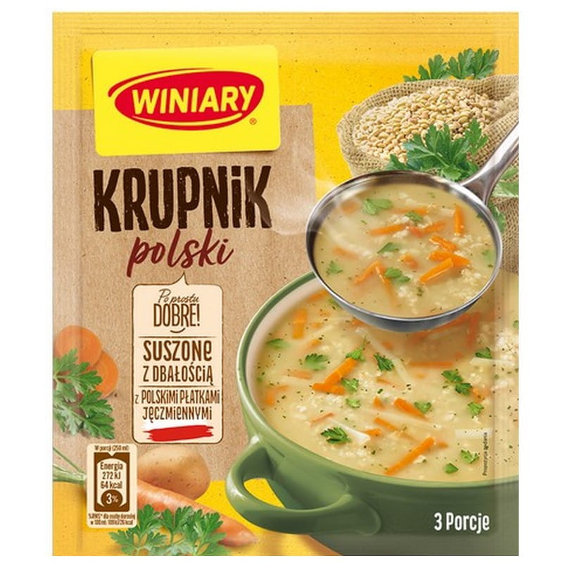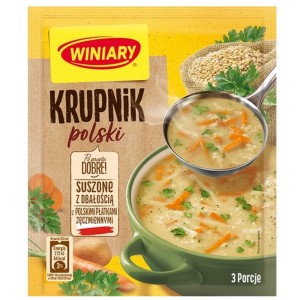 Winiary Zupa Krupnik Polski w opakowaniu 59g to wygodny sposób na szybkie przygotowanie tradycyjnej polskiej zupy. Krupnik, bogaty w kaszę jęczmienną i różnorodne warzywa, jest znany ze swojego sycącego charakteru i głębokiego smaku. Ta gotowa mieszanka pozwala cieszyć się klasycznym smakiem krupnika bez konieczności długiego gotowania.